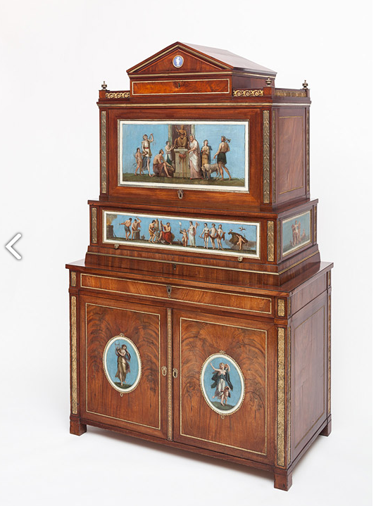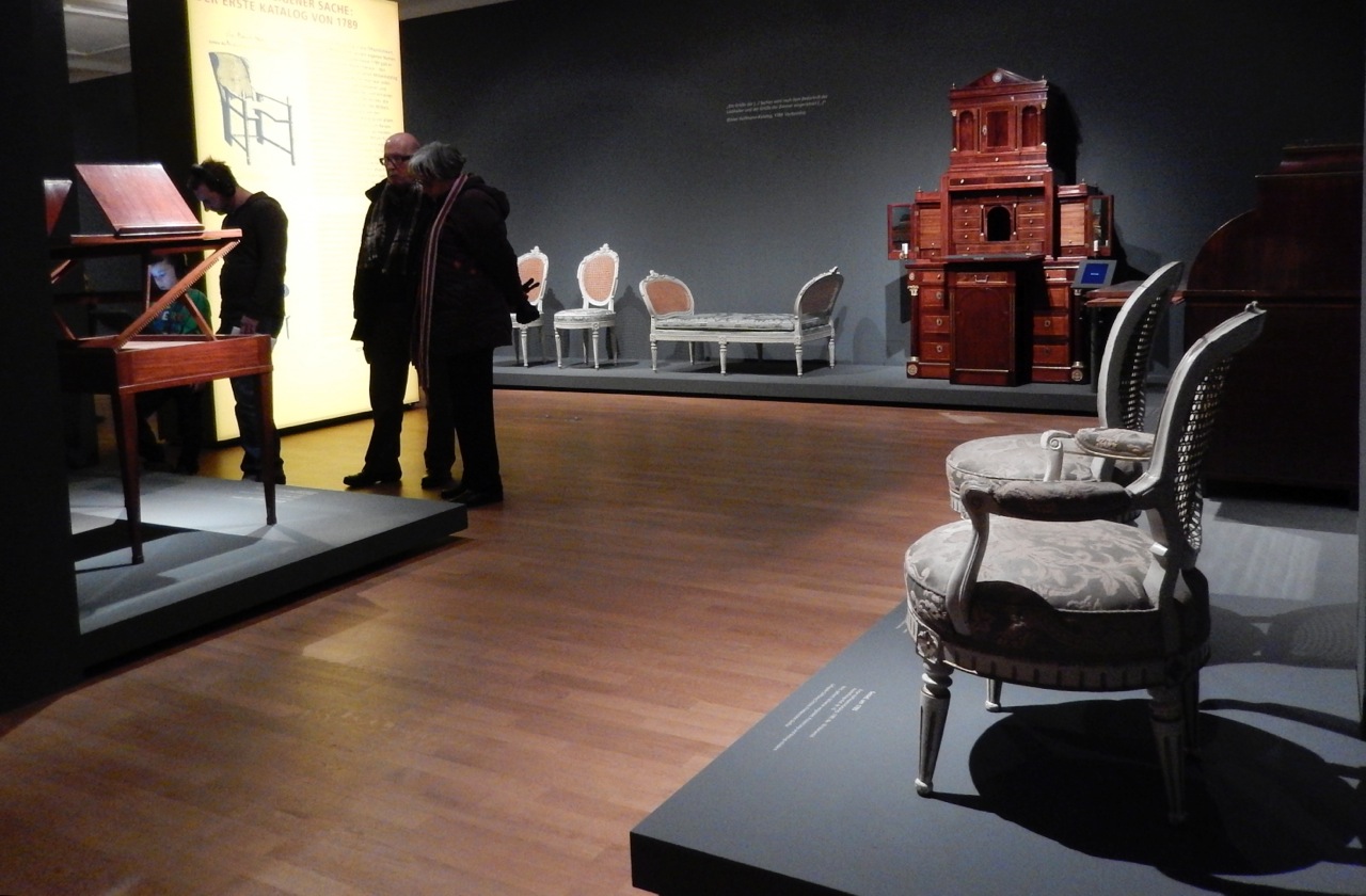 Friedrich Gottlob Hoffmann (1741-1806) war ein Möbeltischler in Leipzig, der seine adlige und bürgerliche Kundschaft mit englisch und französisch beeinflussten, klassizistischen Möbeln versorgte. Er war der erste Tischler in Deutschland, der seine Möbel über, in den Jahren 1789 und 1795 erschienene bebilderte Warenkataloge bewarb, nach denen man bestellen konnte. Zum „billigen Preis“, der die Tischlerkonkurrenz in Leipzig mehr als nur ärgerte, konnte Hoffmann produzieren, weil er neue, rationellere Fertigungsmethoden entwickelte und heimische Hölzer mit Beizen und Polituren so behandelte, dass sie wie feines Mahagoni aussahen. Erst 1796 wurde er als “Chursächsischer Hoftischler” von den Auflagen der Tischlerinnung befreit und baute sich so zwei Werkstätten auf, in denen er bis zu 42 Mitarbeiter beschäftigte. Neben aufwendigen Auftragsarbeiten produzierte er auch günstigere Möbel auf Vorrat, die er dann auf Messen ausstellte (das Ikea von damals?). Auch die enge Zusammenarbeit mit dem berühmten Leipziger Kunsthändler Carl Christian Heinrich Rost (1742–1798) führte zu einer „winwin“ Situation, deren Dokumentation den stimmungsvollen Auftakt zur Ausstellung im Grassi Museum gibt.