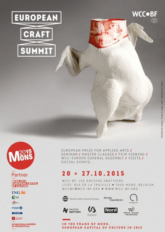 Mons ist in diesem Jahr 2015 europäische Kulturhauptstadt und die Organisatoren des WCC-BF nutzen diese Gunst der Stunde um einen „European Craft Summit/ Europäischen Handwerks Gipfel“ auszurichten, dessen Programm kaum ambitionierter sein könnte. In den Räumen des eindrucksvoll renovierten Klostergebäudes „Anciens Abbatoirs“ gab es schon die vergangenen Jahre herausragende Ausstellungen europäischen Handwerksdesigns und auch der „europäische Preis für angewandte Kunst“ ist hier erfunden und schon mehrfach vergeben worden.