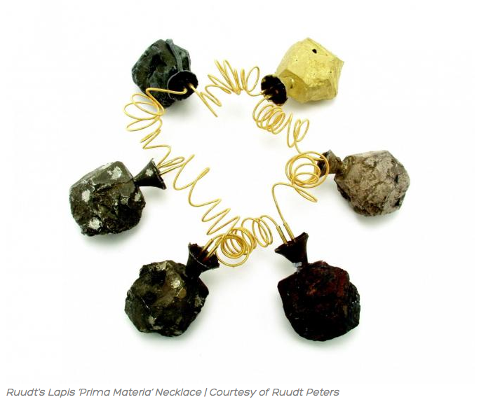 Ruudt Peters Lieblingsstück aus seinem eigenen Werk ist übrigens eine Collier, das er Lapis ‘Prima Materia’ nennt. Normalerweise verwendet er kein Gold, doch mit diesem Stück schuf er einen Halsschmuck aus den sechs wichtigsten alchimistischen Elementen: Blei, Zinn, Zink, Kupfer, Silber und Gold. Er verwendete hundert Gramm 24 Karat Gold für dieses Collier und war fasziniert davon.