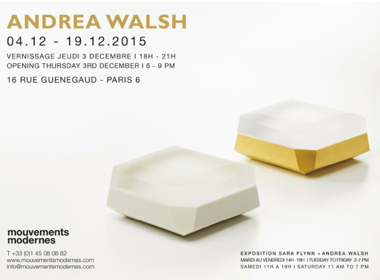 Die exquisiten Arbeiten der schottischen Künstlerin Andrea Walsh wurden zuerst im März 2015, auch von der Galerie Mouvements Modernes , in Frankreich gezeigt. Ihr Talent erkannten Sammler und Connaiseure sofort – Grund dafür die Künstlerin erneut zu dem Aussstellungsprojekt “ La Galerie Imaginaire“ in den Räumen des Kaufhauses Le Bon Marché einzuladen. Zu dieser Ausstellung schuf Andrea Walsh erstmalig und exklusiv für Mouvements Modernes eine Edition von 8 Objekten.