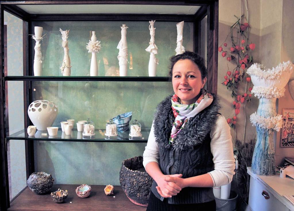 Doch der Blick geht sofort hinaus durch das große Fenster. Vor der Kulisse hoher Ziegelbauten reihen sich hauchzarte Porzellangebilde im Licht. „Lumos“ heißt diese Serie. Schalen und Schälchen, knittrig wie Papier, durchsetzt von transluzenten Ornamenten und vegetabilen Spuren, wie hin geweht. Reale Blüten, Blätter Spitzen haben sich hier verewigt. Tod und Vernichtung brachte ihnen der Brand des Porzellans und lies sie als fragmentarische Silhouetten, als magische Fenster zum Licht in den weißen Scherben zurück. Was für eine Metamorphose! Hochtransluzentes Porzellan mit Materialmixlitophanien nennt es die Künstlerin.