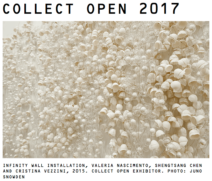 Anmerkung: Collect Open ist prinzipiell nur offen für zeitgenössische Objektkunst, Design und angewandte Kunst – Bewerbungen von freier Kunst wie Malerei, Zeichnung, Graphik Design, Druckwerken, Fotografie und fine art Skulpturen werden nicht akzeptiert.
