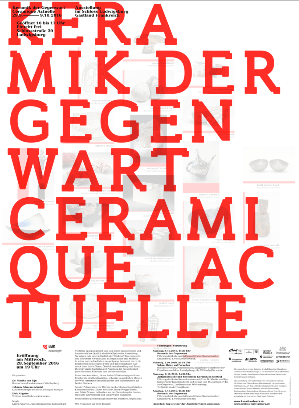 Unter den Ausstellern, 14 aus Baden-Württemberg und 9 aus Frankreich,sind hochkarätige, teilweise in namhaften Museen der Welt vertretene Keramikkünstler aus beiden Ländern. Die Präsentation macht deutlich, wie vielfältig und spannungsreich mit dem Werkstoff Ton gearbeitet werden kann. Keramik und Porzellan gehören zu den ältesten und ursprünglichsten Ausdrucksformen kunsthandwerklicher Arbeit. Es beginnt mit dem Material selbst in seiner unterschiedlichen Färbung und Ausprägung, nimmt mit der Kreativität und dem handwerklichen Können des Keramikers unterschiedlichste Formen an. Ihren endgültigen Ausdruck bekommen die Gegenstände dann durch Glasur, Bemalung und Brand. Die individuelle Gestaltung ist Ausdruck der Persönlichkeit jedes einzelnen Künstlers und unverwechselbar. In jüngster Zeit nimmt das Interesse an keramischen Unikaten wieder deutlich zu. Es werden Keramiken gesammelt, in Galerien angeboten und auch auf Auktionen gehandelt.