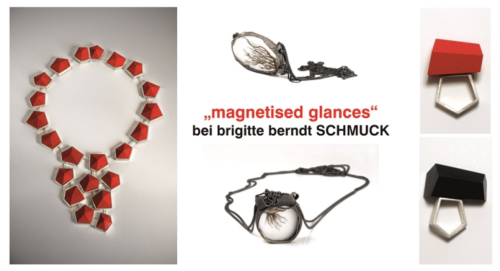 Beide Schmuckmacherinnen sind seit Jahren immer wieder bei Ausstellungen der Galerie vertreten, diesmal zusammen mit Arbeiten, die den Blick wie magnetisiert auf der Trägerin haften lassen…’magnetised glances‘. (Pressetext)