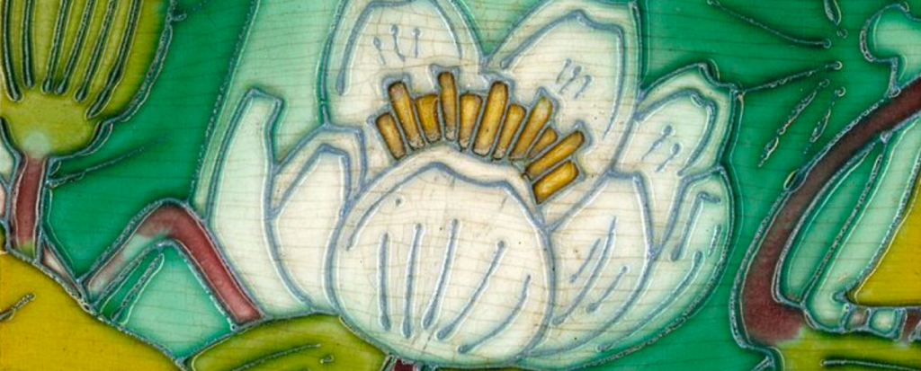 Im Zentrum der Ausstellung steht die Flora des Jugendstils. Das Spektrum der dargestellten Motive, die von der Seerose über Alpenveilchen, Lilie, Klee und Löwenzahn bis hin zur Distel reichen, ist dabei genauso facettenreich wie die Gestaltungsformen bzw. -techniken der Fliesen. Besonders reizvoll ist hier zudem der Vergleich verschiedener Ausführungen der gleichen Fliese.