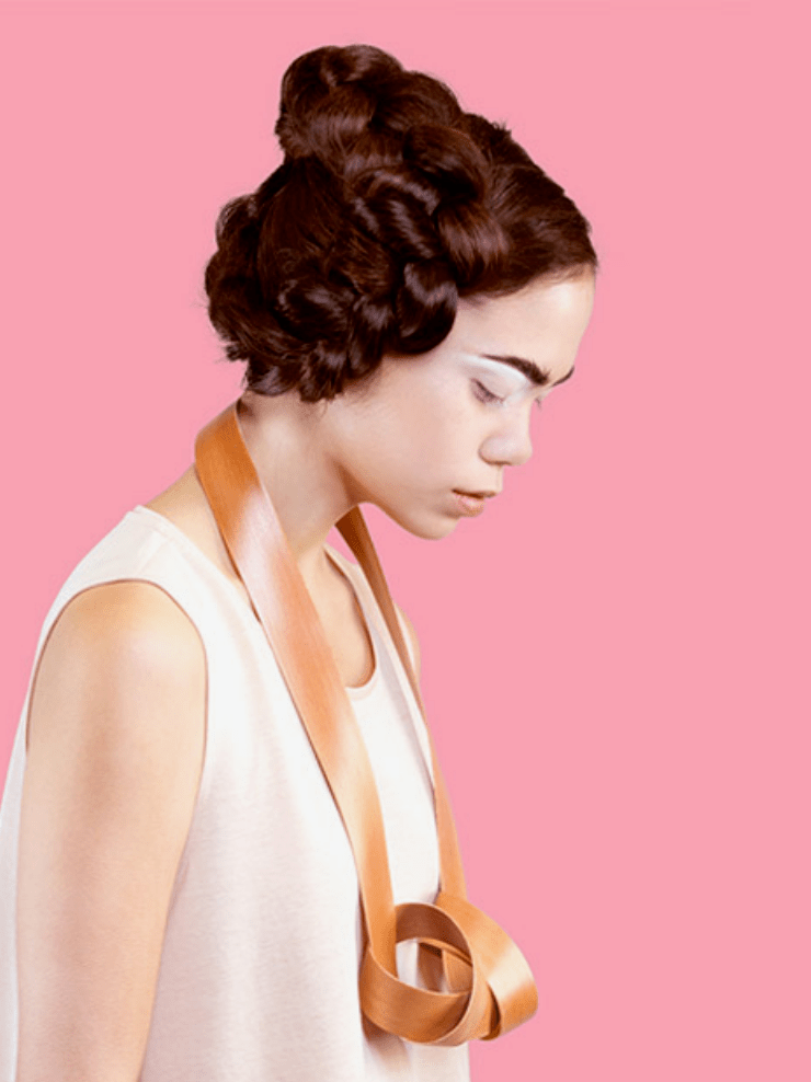 Im Themenbereich Schmuck schuf Alessa Joosten aus Düsseldorf eine grafische und zugleich skulpturale Kette aus Holz. Die Arbeit der Schmuckdesign-Studentin entspricht durch die Verwendung eines nachwachsenden Rohstoffs einem nachhaltigen Gestaltungsgedanken. Durch das geringe Gewicht des natürlichen Materials verfügt das Schmuckstück trotz seiner Größe über Leichtigkeit.