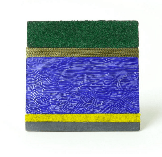 Beppe Kessler’s jüngstes Projekt basiert auf dem wohlüberlegten Wechselspiel zwischen ihren großen autonomen Werken und ihrem Schmuck. Zum ersten Mal wendet sie auf kleinem Maßstab die Techniken an, die sie eigentlich zur Gestaltung ihrer großen Metall-Wandobjekte entwickelt hat, indem sie das Material, bemalt, zeichnet und einkerbt. Im Ergebnis sehen wir eine Gruppe extrem flacher Broschen mit einer visuellen Kraft, die dem nahezu zweidimensionalen Charakter zu widersprechen scheint. Sie könnten auch auf die Oberflächen verwirbelten Wassers anspielen, auf die Räumlichkeit treibender Wolken oder die Weite niederländischer Landschaft. Doch Beppe Kessler beschränkt sich nicht auf graphisches Können. Ihre Affinität zu Texturen und Materialitäten ist zu stark dafür. Als eine Art sanften Gegensatz verwendet sie im Kontrast zu dem harten Metall natürliche Materialien wie Leder oder Furnier, doch vor allem Textilien, ihre vertrauten Begleiter seit vielen Jahren. Diese einerseits als umwicklende Garne und andererseits als Trikot oder Filz bevorzugend.