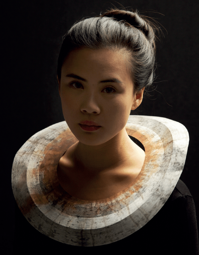 So bekommen wir unter anderem wirklich famosen Schmuck zu sehen, z.B. des in den Niederlanden lebenden Argentiniers Luis Acosta, dessen Kreationen auf der Grenze zwischen textil- und Papierkunst balancieren, mal opulent kompakt in üppiger Farbigkeit, mal den Charme komplexer, sich linear entwickelnder Knoten und Schlingen, beschwörend. Oder auch die besonderen Kreationen von Katja Liebig, Dozentin der Stuttgarter Kunstakademie, deren geheimnisvoller Papierkragen das Titelfoto der Einladung zur Ausstellung reine Verlockung ist, diese zu besuchen.