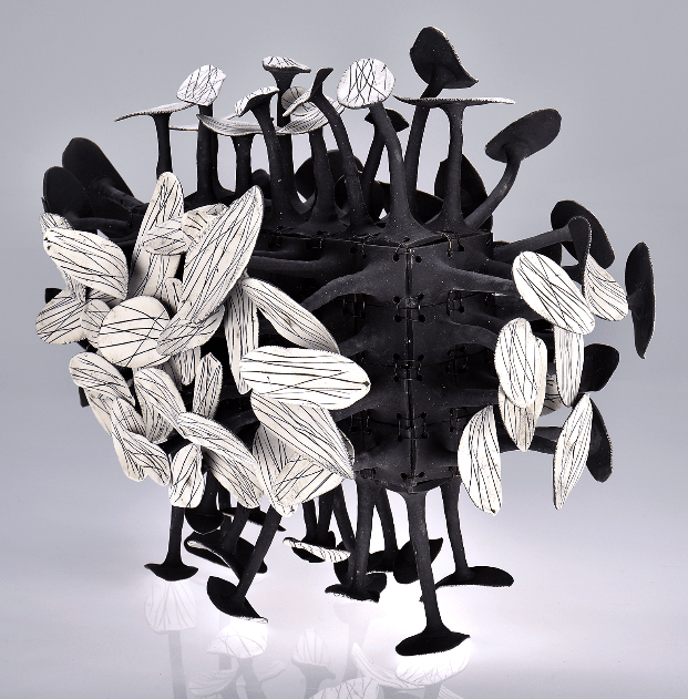 Auch die Skulpturen von Ursula Commandeur (D) scheinen sich bewegen zu können. Diese werden aus kleinen Keramikelementen aufgebaut. Ursula fasst sie mit Draht zu einem größeren Ganzen zusammen. Ihre Formen erinnern manchmal an einem Nagelbett oder einem Kettenhemd, manchmal an einem riesigen Insekt. Faszinierende Gänsehaut in Schwarz und Weiß.