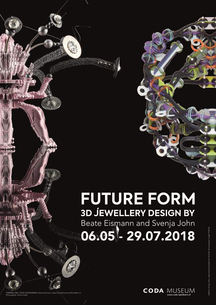 Die Künstlerinnen Beate Eismann und Svenja John verwenden 3D Druck, Laser cut und CAD in ihrer künstlerischen Arbeit. Vom 6.Mai bis 29.Juli 218 stellt das CODA Museum die Entwicklung dieser beiden Künstlerinnen in der Ausstellung Future Form vor. Ein hochkarätiger 3D Drucker wird in die Ausstellung integriert und erlaubt dem Publikum sich mit einem wichtigen Teil der professionellen Praxis von Svenja John und Beate Eismann vertraut zu machen.
