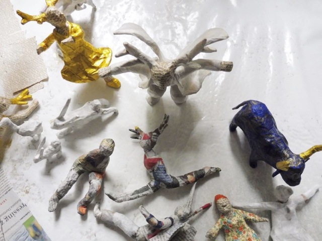 „Heike Roesner hat ein Faible für schräge Typen und bizarre Situationen. Ihre Leidenschaft ist das Papier, ihre Figurenwelten und Geschichten entstehen in der Technik des Papiermaché aus diesem Material. Die Arbeit ist für sie ein Spiel. Spielerisch und leicht erscheinen auch ihre Objekte.