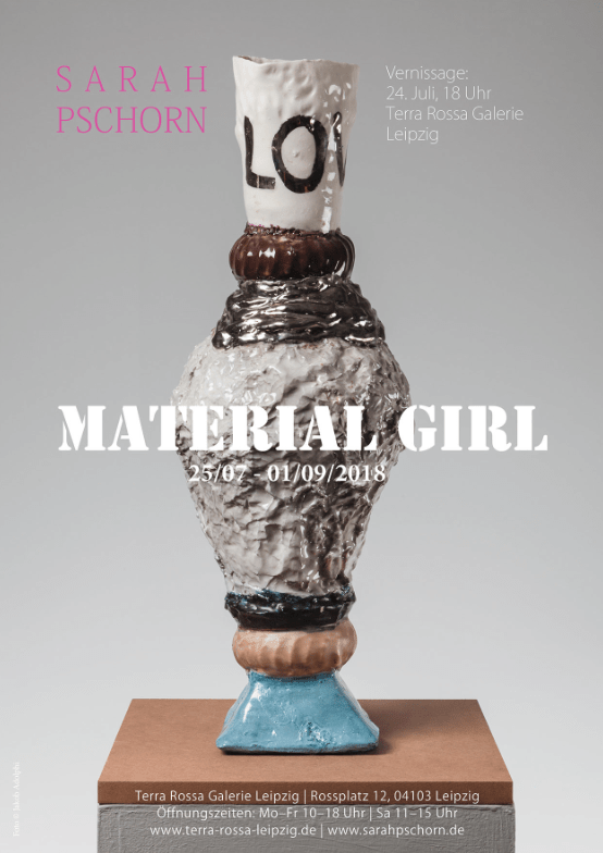 Die junge Leipziger Künstlerin Sarah Pschorn präsentiert in der Terra Rossa Galerie Leipzig ihre erste Einzelausstellung mit dem Titel „Material Girl“. In ihren kraftvollen plastischen Collagen aus Ton, Porzellan und Fundstücken interpretiert und kommentiert sie ein historisches Formenrepertoire. Mit Einflüssen aus dem Barock aber auch aus der Popkultur entstehen zeitgenössische Prunkgefäße. Die Preisträgerin des TALENTE Preis für Gestaltung München, des Grassipreis der Goerdelerstiftung Leipzig und des Perron Kunstpreis der Stadt Frankenthal begreift ihr Schaffen als „ein Plädoyer für das Süßliche, das Sentimentale, für das Spiel zwischen Heiterkeit und Schwermut, für das Verlieren in der Form und der Auseinandersetzung mit der Vergänglichkeit.“ (Pressetext)