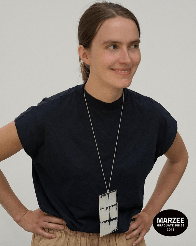 In diesem Jahr wurde Carolin Volz (Titelfoto), ausgebildet an der Burg Giebichenstein – Kunsthochschule Halle, für ihre Halskette SeiSesti, 2018 (Glas, Papier, Silber) mit dem Marzee Graduate Prize 2018 ausgezeichnet: “Nicht nur wir verändern uns, sondern auch die Dinge um uns herum. Sie ändern sich, weil wir sie benutzen oder an ihnen arbeiten. Ich bin an den Spuren dieser Interaktionen interessiert. Sie sind meist unbeabsichtigt, weshalb sie für mich ein besonderes ausstrahlen.“