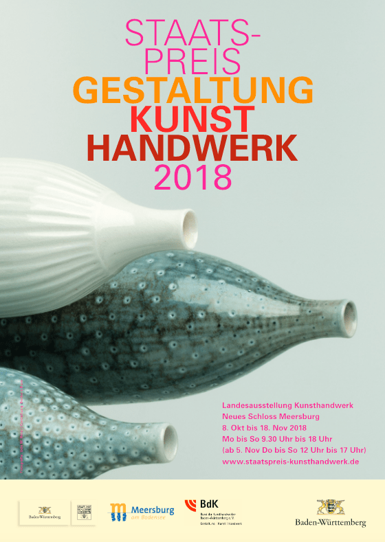Die Landesausstellung Kunsthandwerk 2018 wird vom 8. Oktober bis 18. November 2018 im Neuen Schloss Meersburg präsentiert. Am 7. Oktober 2018 ist die Ausstellung nach der Preisverleihung geöffnet. Während der Laufzeit der Landesausstellung bietet das Rahmenprogramm interessante Einblicke in die Welt der Angewandten Kunst. (Pressetext)