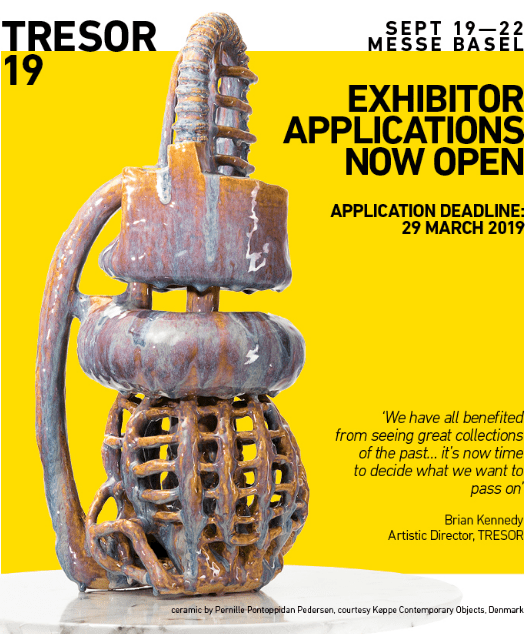 Die zweite Ausgabe der TRESOR contemporary craft in Basel wurde im März für 2018 ausgesetzt. Die Veranstalter begründeten das mit einer Revision des Konzeptes und der Strategie für diese ambitionierte Messe für internationale zeitgenössische Angewandte Kunst. Seither hörte und sah man viel von den Machern der TRESOR. Die quasi Nicht-Kommunikation im Vorlauf zur 1. TRESOR im Herbst 2017 verkehrte sich nun in einen sprudelnden Quell an Informationen.  Eine Fülle von Mailings, Statements und Filmclips die CEO Nadine Vischer Klein und ihren künstlerischen Direktor Bryan Kennedy im unermüdlichen Werben für Autorenobjekte, Künstler und Konzepte, zeigten. Anthony G. Vischer spielte in diesem geradezu euphorischen Beschwörungsreigen von Qualität, Authentizität, Einzigartigkeit und Bedeutung ganz offensichtlich keine tragende Rolle mehr.  Im September wurde dann das Bewerbungsverfahren  für die TRESOR contemporary craft vom 19. bis 22.September 2019 eröffnet – doch nun schreibt CEO Nadine Vischer Klein: