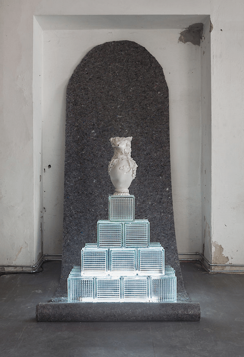 Nun präsentiert die äusserst erfolgreiche junge Künstlerin ihr Werk im MdbK Leipzig im Rahmen des CONNECT Leipzig Programms. Ihre  „First Contact“ ist eine raumbezogene Installation, die die Verbindung von Objektcollagen und ihren architektonischen Umraum erkundet. Die Objekte der Installation, größtenteils gefäßartige Collagen aus Ton, Porzellan, Glas und Fundstücke, interpretieren ein historisch bekanntes Formenrepertoire auf bildhauerische Weise. In der Arbeit „First Contact“ ist die Auseinandersetzung mit Materialität und ihrer Ästhetik spürbar. Stilepochen werden angespielt, polarisieren, ziehen an und stoßen sich ab – eine emotionale Form- und Farbstudie der Gegenwart entsteht. Das Gefäß wird hierbei zum sinnbildlichen Träger der Gedanken und Ideen.