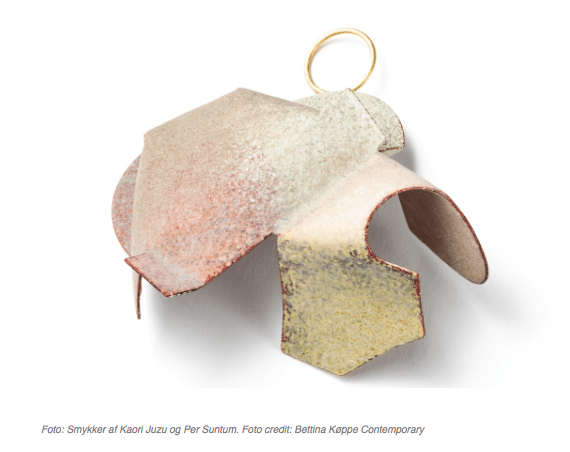 Es ist dieselbe Dualität zwischen kontrollierter Form und taktiler Oberfläche, die das Motiv von Per Suntums und Kaori Juzus Schmuck ist. Hier sind die Materialien edel: Gold, Silber und Edelsteine, aber auch Emaille und rekonstruierte Korallen. Ihre Arbeiten sind eine Fortsetzung der langen Tradition der dänischen Handwerker-Inspiration aus Japan, die seit den 1870er Jahren besteht und im dänischen Design und der handwerklichen Identität des 20. Jahrhunderts eine große Bedeutung hatte. Bornholms Töpfer Gertrud Vasegård muss als primärer Vertreter des dänischen Japaneseismus angesehen werden, und Per Suntum und Kaori Juzu präsentieren diese Tradition auf der Insel. (frei übertragen nach dem dänischen Pressetext)