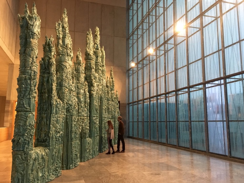 Das Museum der Bildenden Künste in Leipzig zeigt auf seiner großen Terrasse Trenkwalders bisher monumentalste Plastik aus gebranntem und farbig glasiertem Ton. Das 13 Meter lange und sieben Meter hohe Werk besteht aus 91 Einzelteilen. Die bläulich-grün schimmernde Glasur reflektiert das wechselnde Tageslicht und betont die heteromorphe Oberfläche der Plastik. Die raumgreifende Arbeit gleicht einer kunstvoll gestalteten Fassade, die durch ihre Positionierung im Raum von beiden Seiten betrachtet und durchschritten werden kann. Über den schmalen Durchgängen erheben sich Türme und Strukturen mit figürlichen und ornamentalen, opulent ausgeführten Formen, deren rhythmische Anmutungen an Naturprozesse, Kreisläufe und mythische Wandlungen erinnern.
