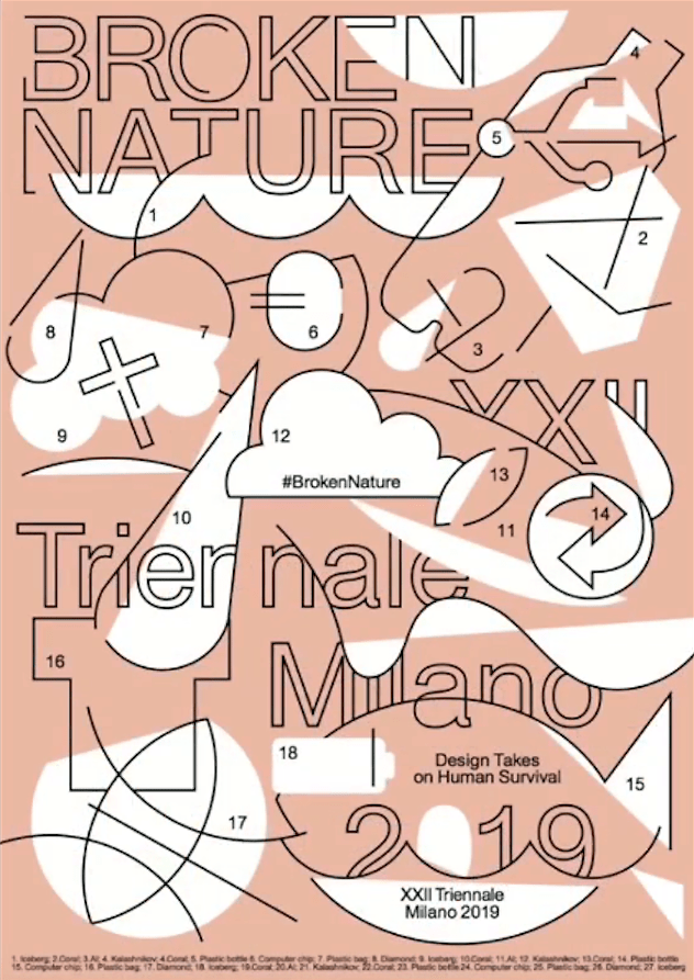 Design setzt auf menschliches Überleben, hebt das Konzept des restaurativen Designs hervor und untersucht den Zustand der Fäden, die den Menschen mit seiner natürlichen Umgebung verbinden – einige ausgefranst, andere völlig durchtrennt. Bei der Erforschung von Architektur- und Designobjekten und -konzepten auf allen Ebenen und in allen Materialien würdigt „Broken Nature“ die Fähigkeit von Design, einen Einblick in die Schlüsselthemen unserer Zeit zu gewähren, jenseits von frommer Ehrfurcht und unschlüssiger Angst. Indem sie sich auf die Existenz und Beständigkeit des Menschen konzentriert wird die XXII Triennale die Bedeutung kreativer Praktiken betonen, die die Bindungen unserer Spezies mit den komplexen Systemen der Welt betreffen und erforderlichenfalls Reparaturen durch neue Objekte, Konzepte und Systeme entwickeln.