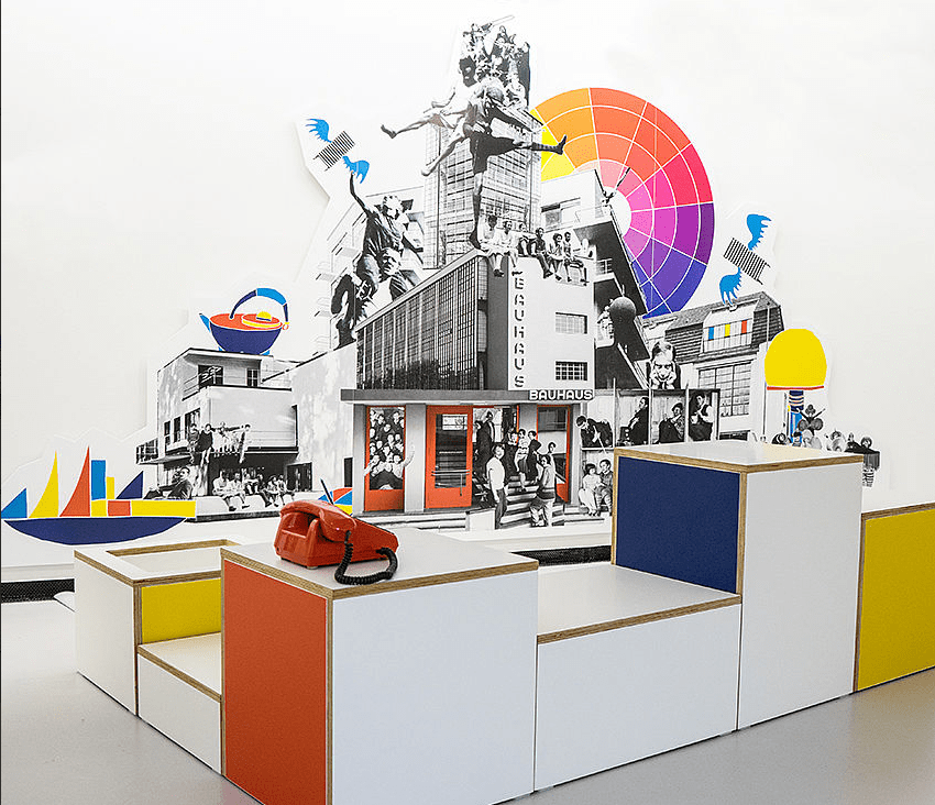 Die Ausstellung animiert zum Experimentieren und Ausprobieren. Einige der wichtigsten Bauhäuslerinnen und Bauhäusler stehen Pate für die zehn verschiedenen Stationen. Die Kinder können Bilder gestalten wie Lyonel Feininger oder das Zusammenspiel von Licht, Farbe und Schatten wie bei László Moholy-Nagy erleben. Sie können sich an großen Zeichnungen wie Johannes Itten probieren, sich verkleiden und tanzen wie die Figurinen von Oskar Schlemmer, weben wie Gunta Stölzl, Metallstäbe biegen wie Marcel Breuer und Mart Stam oder die Form eines Stahlrohrstuhles mit einem heißen Draht nachspüren. Im imaginären Büro von Bauhaus-Direktor Walter Gropius werden die Kinder selbst zu Architekten, erkunden das Bauhaus und bauen die Meisterhäuser im Maßstab nach. Ihre Kreativität können sie in der Druckerei mit einer Schablonenschrift nach dem Vorbild von Joost Schmidt voll ausleben.