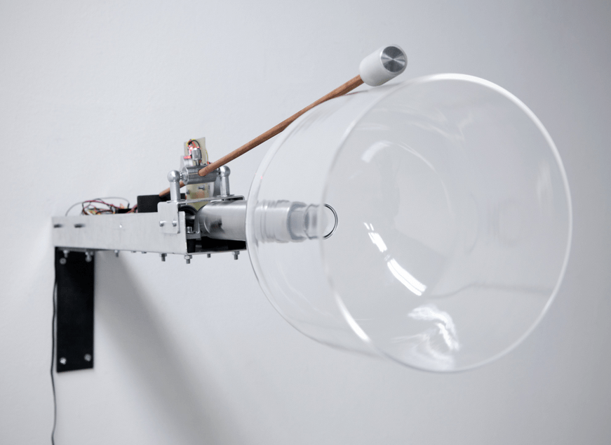 Dieses Jahr 2019 ging der mit 10.000 Euro ausgestattete Jutta-Cuny-Franz-Erinnerungspreis an die interdisziplinär arbeitende Multi-Media- Künstlerin Evelina Rajca (Polen/Deutschland). Ihr Werk lässt sich folgendermaßen beschreiben: an einer Wand ist ein Metall-Arm montiert, mit einer Glasglocke als „Hand“ und einem hölzernen Klöppel, der am Ende mit einem Silicon-Zylinder verdickt ist. Die Glasglocken-Hand zeigt auf ihr „Zwillingsmodell“, das an der gegenüberliegenden Wand befestigt ist. Die beiden genau gleichen Glas-Metall-Holz-Gebilde erinnern an Roboter-Arme. Die Holzklöppel schlagen auf die Glasglocken, die um die eigenen Achsen rotieren. In unterschiedlichen Abständen, mal nach fünf Sekunden, mal nach sieben Sekunden. Gläserne Klänge dringen durch den Raum, schwingen, schweben, vibrieren – mal zart, mal kräftiger, mal ausladend laut. Ein sphärisches Konzert, drei bis fünf Minuten lang, automatisch gespielt von zwei Roboterarmen.