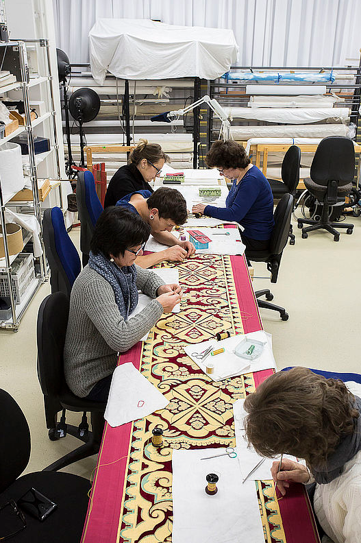 Mitte 2016 begannen hierfür die Arbeiten an der BURG nach Projektvergabe durch den Staatsbetrieb Sächsisches Immobilien- und Baumanagement und unter wissenschaftlicher Leitung von Dr. Sabine Schneider. Vierzehn Mitarbeiterinnen und Mitarbeiter der Textilmanufaktur erstellten diese in den vergangenen Jahren unter der fachkundigen Anleitung und Koordination von Werkstattleiterin Ilona Fitzner. In aufwändiger Handarbeit nach historischem Vorbild wurden Samtapplikationen auf in Frankreich hergestelltem Goldbrokat gestickt, in Italien gewebter Goldstoff für die Innenausstattung genutzt, unter anderem Bett- und Fenstervorhänge, Bettkränze, Portieren sowie Wandbehänge akribisch und detailgenau in der Textilmanufaktur rekonstruiert.