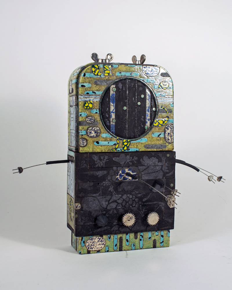 Ein Kaffeeautomat, ein Messerblock, eine Aufschnittmaschine oder ein Sicherungskasten – all diese Gegenstände aus dem häuslichen Umfeld finden bei Judith Püschel höchste Beachtung und werden in der Rakutechnik verewigt. Nicht als realistische Kopien, sondern als formal und farblich ausgesprochen eigenwillige Erscheinungen mit erzählenden Oberflächendekors und vielsagenden Zusätzen.