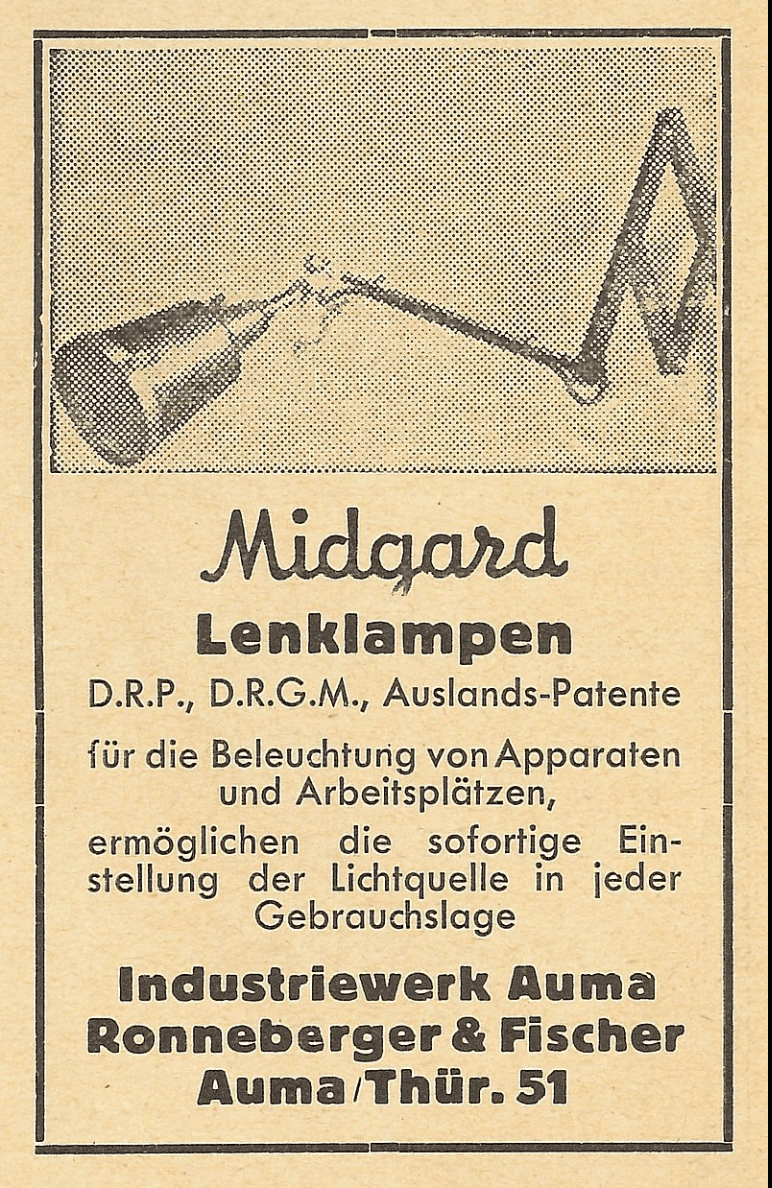 Mit der ersten lenkbaren elektrischen Leuchte setzte Curt Fischer (1890–1956), Gründer des Leuchtenherstellers Midgard, 1919 einen Meilenstein für die sich damals rasant entwickelnde Industrialisierung. Seine bahnbrechende Erfindung: Die Lichtquelle der „Midgard“ kann man zu sich heranziehen, ihren Kopf drehen und den Lichtkegel im gewünschten Winkel mit nur einer Hand einstellen. Damit setzte der Ingenieur der damals üblichen, starren Allgemeinbeleuchtung als einziger künstlicher Lichtquelle ein Ende. Bis dahin warfen die Arbeiter*innen an ihren Werkbänken selbst Schatten auf ihre Arbeitsflächen.