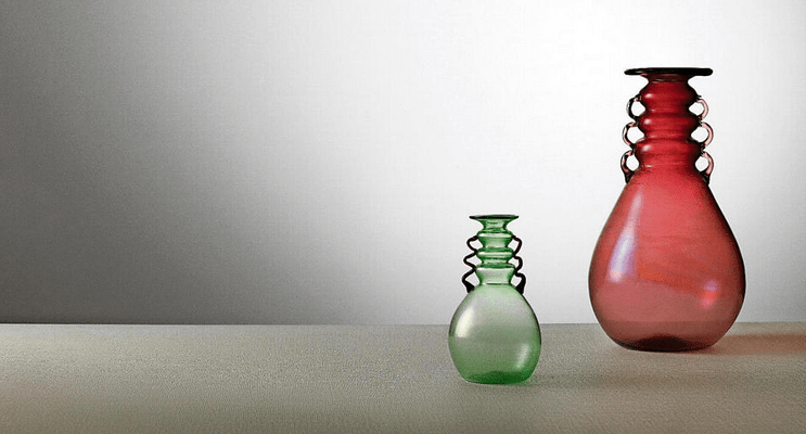 Meist sind es Vasen, Schalen, Teller, aber auch Leuchter und Trinkgläser, die von Zecchin entworfen und dann von den Glasbläsern in der Hütte ausgeformt werden. Die sehr erfolgreiche Zusammenarbeit führte zu hunderten von Entwürfen. Die Prototypen wurden auf den großen, internationalen Verkaufsmessen vorgestellt, oft prämiert und schließlich über exklusive Showrooms an das gehobene Bürgertum verkauft.(Pressetext)