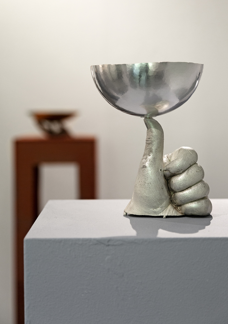 Gerd Rothmann beschäftigt sich auch in seinen Objekten mit Körperabrücken. Seine Kerzenständer erinnern uns stark an seinen Schmuck, die Gefäße sind logische Fortsetzung seiner Auseinandersetzung mit dem Körper. Rothmann vertritt eine strenge eigene Position bezüglich Inhalt und Form und hebt sich von den anderen Arbeiten durch seine figurative, narrative Formensprache ab. (Text: Kinga Zobel)