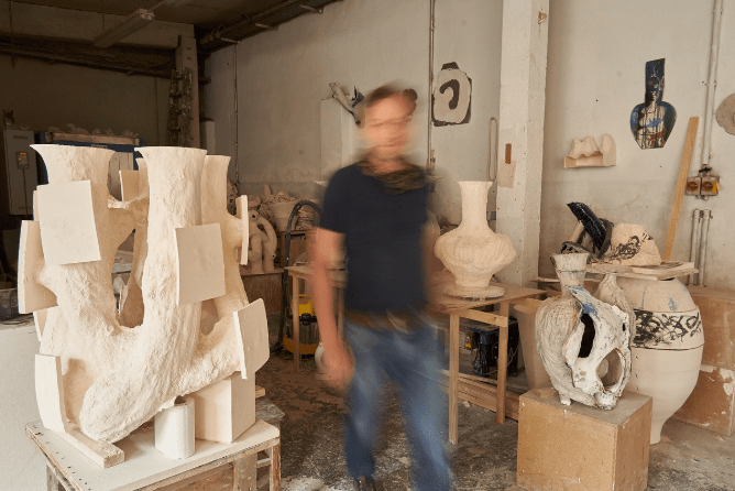 Die neuen Arbeiten zeigen eine Reihe von Variationen auf Sprühfarben bei der Suche nach einer frischen Ästhetik in Kombination mit den Glasuren. Von der Gestalt her zielt er in den neuen Konstruktionen auf eine verdrehte Symmetrie mit einer Silhouette, die vage an eine Vase erinnert und um eine Achse rotiert, ganz so, als kämen sie frisch vom Plattenspieler eines DJs.