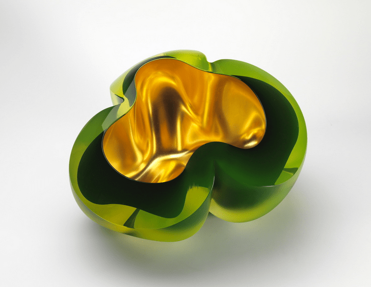 Mit ihrer Reihe imposanter Glasgefäße entfaltet Nanning ein visuelles Vokabular von Pflanzen und Früchten, das alle Dinge umfasst, die klar und leuchtend sind. Wie nass, gefroren und gefrostet, eine zarte und kostbare innere Leere verbergend. Farbe spielt eine wesentliche Rolle in Nannings Werk. Sie kombiniert dickwandiges, kräftiges Glas mit zarter Metallvergoldung. Nanning ist konsequent vom Pflanzen inspiriert und spielt mit Texturen und Lichtreflexen. Ihre Serie von kurvenreichen und gefalteten Formen zeigt Variationen von Schattierungen und Glanz.