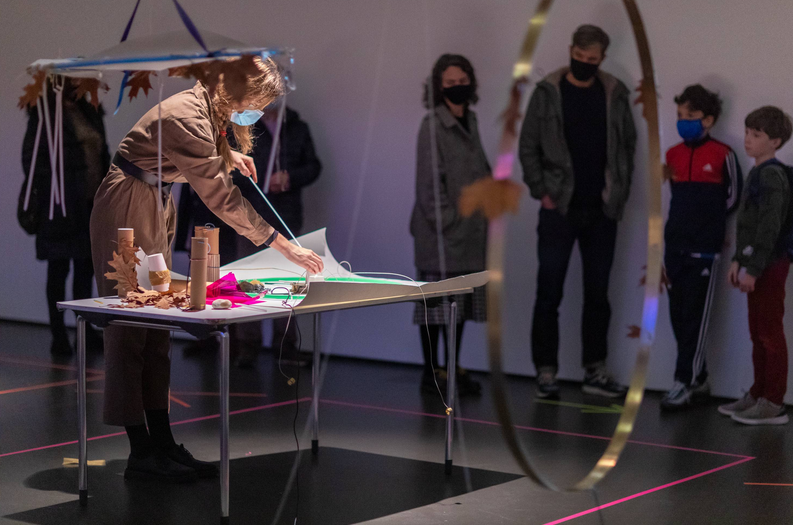 Rita Evans lebt und arbeitet in Großbritannien. Für die Künstlerin mit britisch-kanadischen Wurzeln ist der Raum eine Bühne. Dafür entwickelt sie aus Keramik, Textilien, Wasser, Holz und Metall Objekte, die sich an der Schnittstelle von Skulptur, Display und Instrument bewegen. Die musikalische Aufführung lebt von der Kommunikation der Performerinnen untereinander, die gemeinsam am selben Instrument spielen. Evans verknüpft alte und rituelle Musiktraditionen mit zufälligen und spontanen musikalischen Entscheidungen und stimmt die Instrumente auf die Eigenschaften des Ortes und die Interessen der Performerinnen ab.