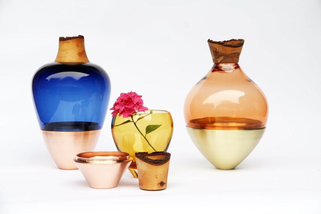 Seit vielen Jahren arbeite ich schon mit der deutsch/finnischen Designerin Pia Wüstenberg zuammen. Ihre Wohnaccessoires, „Stacking Vessels“ und deren Verwandte, folgen einer sehr klaren ästhetischen Formensprache mit diesem gewissen Twist. Pia ergründet völlig unerschrocken die Möglichkeiten unterschiedlichste Materialien und Handwerke miteinander zu kombinieren. Glas in transparenter, gleichwohl leuchtender Farbigkeit kombiniert sie mit Keramik, Buntmetallen, Holz. Sie setzt klassische Vasenformen aus verschiedenen Schalen- und Gefäßformen zusammen, die als Einzelteile funktionale und ästhetische Accessoires sind und im Zusammenwirken spektakuläre Highlights setzen.