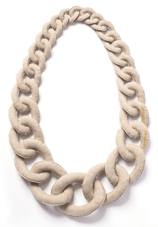 Der Fokus auf Goldtextilien führte zu DLUG – DLOG und zur Idee, Schmuckarbeiten auszustellen, die im Vergleich dazu gar nicht aus Gold, sondern überwiegend aus Textilien gefertigt sind. Daraus ergibt sich eine interessante Wechselwirkung und Korrelation, es eröffnet eine fortlaufende Erzählung des Potenzials von zeitgenössischem Schmuck in Textilien und unter Verwendung textiler Techniken.