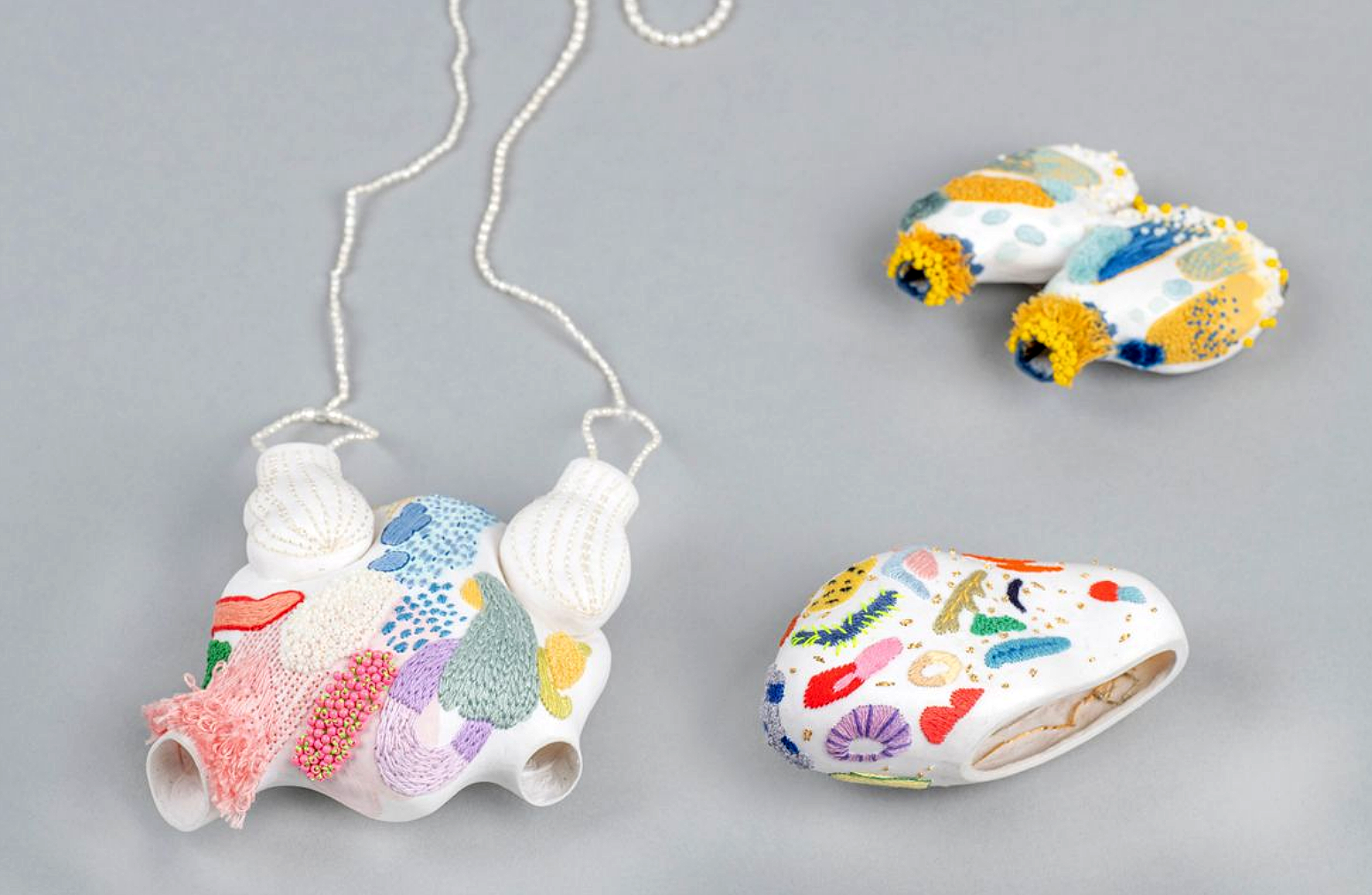 Auf den ersten Blick könnte es Porzellan sein. Die Formen sind organisch, an Lebewesen erinnernd, das Material ist leicht – Hanji, koreanisches Papier, überwuchert von Stickerei, die fein gezeichnet wirkt. Mit rhythmischen Stichen breiten sich farbige Linien, Inseln, Punktewolken über die Papierkörper, wachsen durch ihre Wände hindurch und aus ihnen heraus. Eine heitere, geheimnisvolle Welt muss es sein, aus der diese Wesen kommen – man möchte mehr wissen über sie. Vielleicht dort leben? (Begründung der Jury)