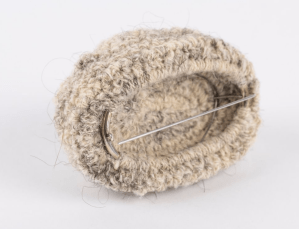 Eine Wollmütze im Puppenformat? Eher eine locker sitzende Haube. Eine, wie sie unsere Großmütter früher trugen, um die Frisur nicht zu zerdrücken. Obenauf allerdings eine kreisrunde Öffnung, aus welcher Haare einzeln herausstehen. Fast stachelig wirken diese. Als wollten sie das Innere dieser nestähnlichen Form schützen und nur ungern den Blick darauf freigeben. Auf sehr originelle Weise verarbeitet Vanessa Zöller die Perlen ihrer Großmutter zu einer Brosche. Sie verknüpft und umhäkelt diese mit einem selbstgesponnenen Faden aus Wolle und menschlichem Haar. Erbstück nennt sie dieses Schmuckstück, das beim Betrachten eine Vielzahl an ambivalenten Gefühlen auslöst. Das Werk berührt, macht neugierig, verspricht Geschichten. Gleichzeitig bleibt es zurückhaltend, persönlich und privat, ein Erbstück eben. (Begründung der Jury)