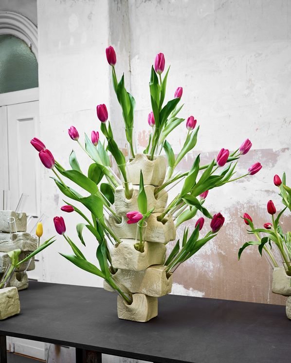 In vielen Jahren hat Guido Geelen seine Meisterschaft darin entwickelt, alle möglichen lebenden und nicht lebenden Dinge zu gießen und sie in ungewöhnliche Metall- und Keramikskulpturen zu verwandeln. Seine mit Seladon glasierten, aufeinander gestapelten Tonkübel mit Löchern für Blumen, sind seine Interpretation der Delfter Tulpenvase. Sie sind eine Anspielung auf das historische Paradigma der Anpassung des chinesischen Porzellan Stils an den Wahn des holländischen Tulpenfiebers im 17. Jahrhundert. Heute zählen sie zur Grundausstattung in vielen Museumsshops, meist made in China.