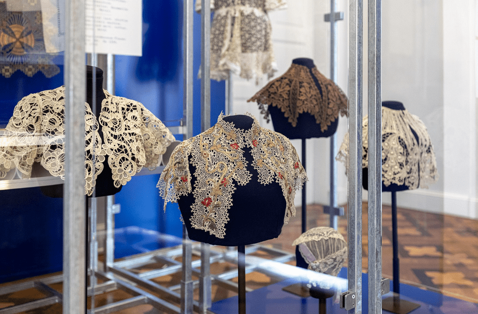 Die faszinierenden Entwürfe für Maschinenspitzen werden von Textilien, Vorlagenmappen und Modefotografien aus den ehemaligen Sammlungen der Kunstschule, die den Studierenden einst als Inspiration dienten, ergänzt. Es sind die einzigen textilen Zeugen aus der Ära der Kunstschule Plauen, die trotz der Zerstörung der Gebäude im Zweiten Weltkrieg bis heute als Beispiele des Kunstschulbestandes in der Sammlung des Vogtlandmuseums bewahrt werden konnten. Inventarbuch und Ankaufsunterlagen verbrannten und so bleibt die Herkunft der meisten Stücke auch heute lediglich eine Vermutung.