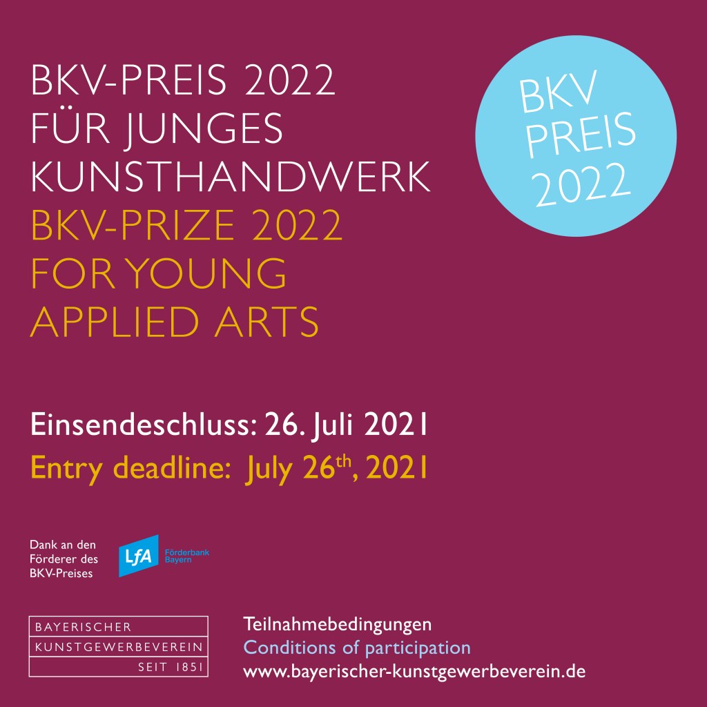 Bis zum 26.07.2021 kann sich der kreative Nachwuchs um den BKV-Preis für junges Kunsthandwerk erneut bewerben. Die Dotierung der Preise, sowie auch das mit den Auszeichnungen verbundene Renomée, soll junge Handwerkskünstler und Designer, die nach einer abgeschlossenen Ausbildung noch am Anfang ihrer professionellen Karriere stehen, fördern und ihre Ambitionen sichtbar machen. Die Ausschreibung richtet sich international an alle Gewerke.