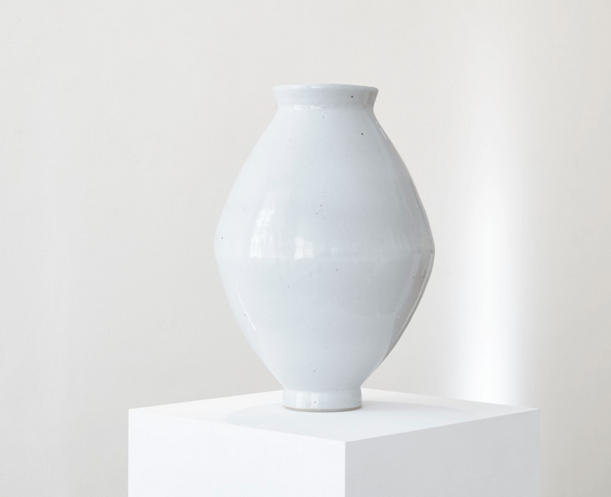 Im Titel der Ausstellung der Galerie Jahn und Jahn in München mag sich ein merkwürdiges Gefälle von Objektbenennungen ausdrücken. Doch sind es gerade die programmatischen Eckpunkte in Young-Jae Lees heutigem Schaffen. Spindelvasen – im Grunde mehr Objekt als Vase – leben von ihrem Volumen. Ihre Formen sind von Ausdehnung und Verengungen, von weichen Konturen und scharfen Kanten gekennzeichnet. In ihrer weitesten Ausdehnung zusammengesetzt, können zwei Schalen in gleichem Verhältnis, aber auch, wie in der Ausstellung zu sehen, ungleich mit einer deutlichen Längung der oberen Schale in weichem Übergang zueinander montiert und zudem in dunkler Farbigkeit glasiert sein. Die Spindelvasen sind Synthese einer konstruierenden Gestaltung westlicher Manier und koreanischen Formenguts, den sogenannten Mondtöpfen. Der künstlerische Anspruch, den Young-Jae Lee in diesen Gefäßen an sich erhebt, entspricht der Qualität der koreanischen weißen, schmucklosen Porzellangefäße der Joseon-Periode [1], deren außerordentliche Schönheit in den ästhetischen Idealpaaren des Einfachen und Edlen, des Emotionalen und des Beherrschten, der Vielfalt im Gleichen und Abweichen vom Normativen liegt.
