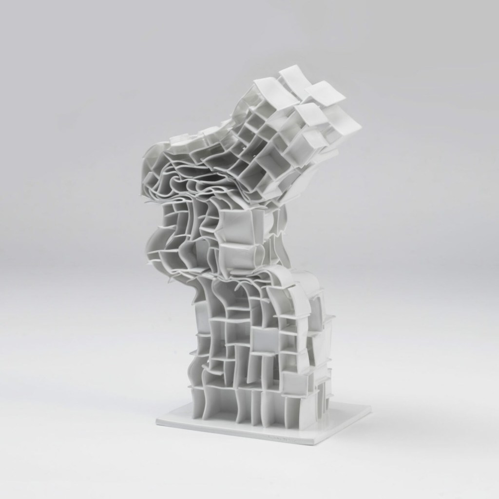 Ihre Porzellanbauten und ihr futuristisches Design zeigen eine zerbrechliche Welt im Zwielicht, die dem Untergang geweiht ist. Die ungarische Künstlerin fixiert einen Moment in der Zeit, einen Kipppunkt. Ihre geisterhaften Wolkenkratzer, die einen großen Teil der in der Galerie de l’Ancienne Poste gezeigten Ausstellung ausmachen, sind nie ganz senkrecht. Sie sind auch nie ganz unten, sondern im Moment ihres Zusammenbruchs fixiert. Wie könnte man nicht an den Angriff auf die New Yorker Zwillingstürme am 11. September 2001 erinnert werden, wenn man einige Werke sieht, die als Duo funktionieren? Die Architektur wird bei Pálma Babos organisch. Die Gebäude neigen sich, biegen sich, krümmen sich, verziehen sich und winden sich. Die Künstlerin modelliert das Chaos, doch paradoxerweise geht von ihren Werken ein Eindruck von Gelassenheit aus, als ob die zugrunde liegende Gewalt durch die Sinnlichkeit des Materials, die Ruhe der Oberfläche und das makellose Weiß, das durch das Spiel von Licht und Schatten Grautöne annimmt, etwas gemildert würde.