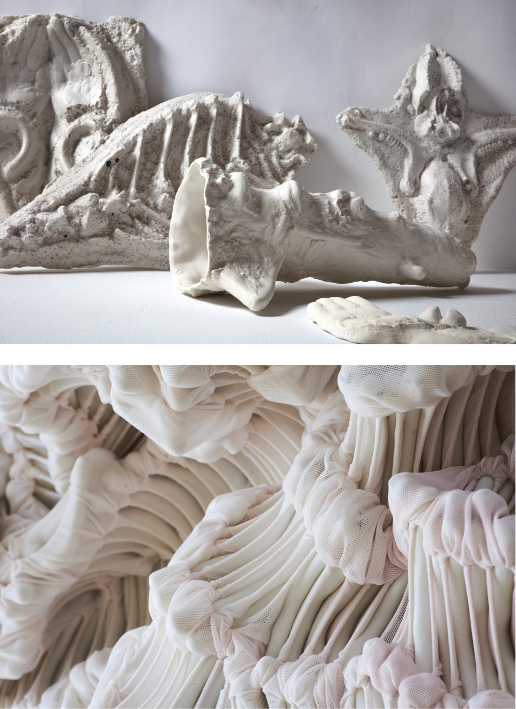 Daniela Bergschneider schafft organische Strukturen in Textilien und Keramik, die Wachstumsprozesse in der Natur imitieren. Die skulpturalen Werke sind wie Körper aus Hunderten von Porzellanelementen aufgebaut, die von einem leichten und flexiblen Gewebe umgeben sind. Sie spiegeln gleichzeitig unser inneres und äußeres Selbst wider, durch Knochen und Haut, Textur und Umhüllung.