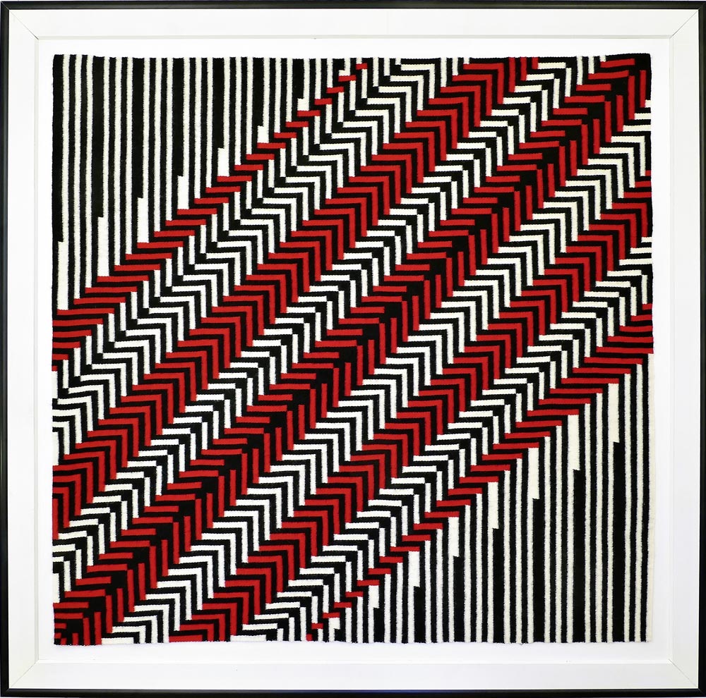 Die Arbeiten von Kat von Stenglin und Christiane Dreyer entstehen am Hochwebstuhl. Während von Stenglin ihre Werke ausdruckstarker grafischer Qualität mit Wolle auf Leinen erschafft, verwebt Dreyer wellenförmige Streifen von farbiger Wellpappe, die schließlich als Relief auf einem Holzträger fixiert werden. Auf unterschiedliche Weise entsteht bei beiden ein Moment dreidimensionaler Wirkung. Bei von Stenglin führen visuell-irritative Effekte zum Eindruck von Bewegung, Vibration und Überschneidung der auf dem Quadrat basierenden Bildformen. Bei Dreyer hingegen evozieren tatsächliche Erhebungen des künstlerischen Materials den Eindruck von teils figurativer Raumtiefe.