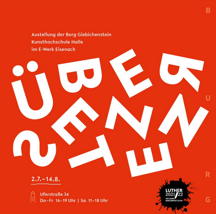 Anlässlich des 500jährigen Jubiläums der Bibelübersetzung Martin Luthers auf der Wartburg in Eisenach werden die Spuren und die Wirkkraft dieser Übersetzung mit vielfältigen und überregionalien Projekten gefeiert. Darin reiht sich auch die Ausstellung Übersetzen im ehemaligen Elektrizitätswerk von Eisenach ein. Von Samstag, 2. Juli bis Sonntag, 14. August 2022, sind in eben diesem alten Industriebau in der Uferstraße die Arbeiten von fünfzehn Künstler*innen aus Halle zu sehen. Studierende, Absolvent*innen und Lehrende aus den Fachklassen Plastik/Keramik, Buchkunst und Bildhauerei der Kunsthochschule Burg Giebichenstein zeigen, was im Laufe der zweijährigen Zusammenarbeit mit der Stadt Eisenach entstand. Objekte aus Holz, Keramik, Metall oder Papier, Installationen in Bild, Schrift und Ton füllen alle drei Stockwerke des Gebäudes.