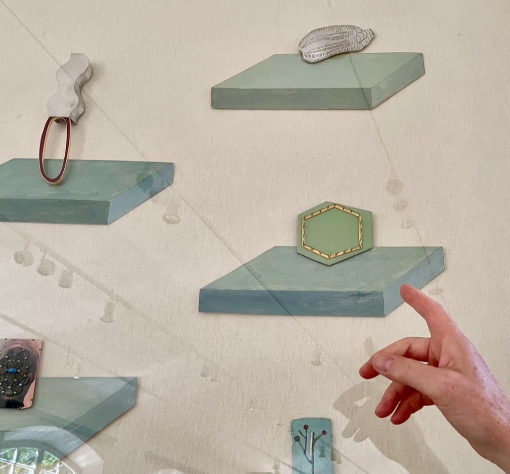 Der Paradiesgarten – den die Künstlerin metaphorisch in ein, mit einem schief gesetzten goldenen Drahtzäunchen eingehegtes grünes Sechseck übersetzt – ist auch in der Ausstellung zu finden. Doch genau genommen, ist die gesamte Präsentation ein Paradiesgarten, in dem Margit Jäschke ihre fantasievollen Transformationen der bits und pieces ihrer, aber eben auch unserer Welt, als ein intuitiv geordnetes Universum inszeniert. Die Exposition der Objekte, vereinzelt, in Reihen oder in Gruppen, lässt sich wahlweise wie ein Bilderbuch, ein Album, eine Enzyklopädie „lesen“. Es stellen sich Fragen, es gibt manchmal auch Antworten, einiges scheint auf realen oder gemalten kleinen Podesten davon zu fliegen oder im Landeanflug. Im Reich der Ideen von Margit Jäschke verwirbeln Gewißheiten zu rätselhaften Narrativen und eigenwilligen Kompositionen – und verführen zu eigenen Gedankenspielen.
