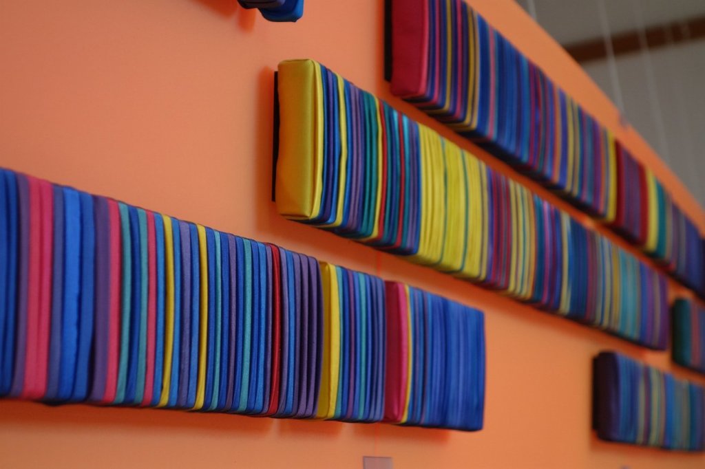 Im Mittelpunkt der Ausstellung steht ein Textilrelief, das auf einer Komposition von Johann Sebastian Bach („Gigue“, Französische Suite Nr. 5) beruht. Aus der Überlegung, wie die Musik – auch wenn sie nicht hörbar ist – immer wieder angeschaut werden kann, entwickelte Meyer-Hahn ein Textilrelief: Jeder Ton/jede Farbstufe ist ein als weiche Falte gelegter Stoffstreifen, auf Spannung gebracht und rückseitig, für den Betrachter unsichtbar, auf schmale Untergrundplatten montiert. Das Farbsystem für die Noten hat Gisela Meyer-Hahn eigens für das Projekt entwickelt. Geschaffen hat sie eine Farbabwicklung von fast 1.500 Einzelstufen. Auf einer Länge von sieben Metern lässt sich die „Gigue“ nun von links nach rechts wie eine Noten-Notierung ‚lesen‘. „Die Falten empfinde ich wie Unendlichkeit von Wellenkämmen auf dem Wasser, auf denen Licht reflektiert“, sagt Meyer-Hahn. (Pressetext)