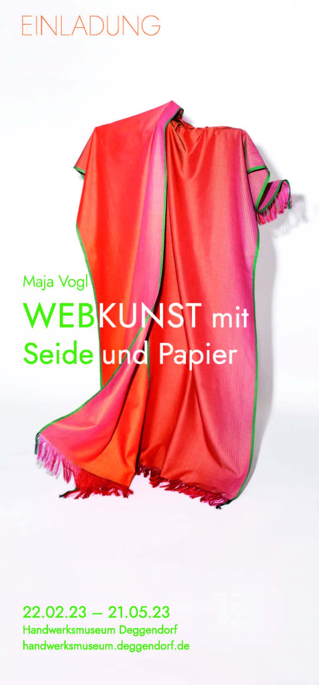 Maja Vogl wurde 1956 in Kempten im Allgäu geboren und begann 1975 eine Lehre zur Handweberin in Bayreuth, die sie 1977 mit der Gesellenprüfung abschloss. Seitdem arbeitet sie in ihrer eigenen Werkstatt. Von 1978 bis 1985 studierte sie Malerei an der Akademie der Bildenden Künste in München. 1995 wurde sie Mitglied im Bayerischen Kunstgewerbe-Verein, München und 1996 Mitglied der Gedok München. Maja Vogl übernahm 2001 für drei Jahre die künstlerische Leitung der Nürnberger Gobelin-Manufaktur. Im Jahr 2008 erhielt sie den Bayerischen Staatspreis, im Jahr 2011 den Danner-Ehrenpreis. (Pressetext)