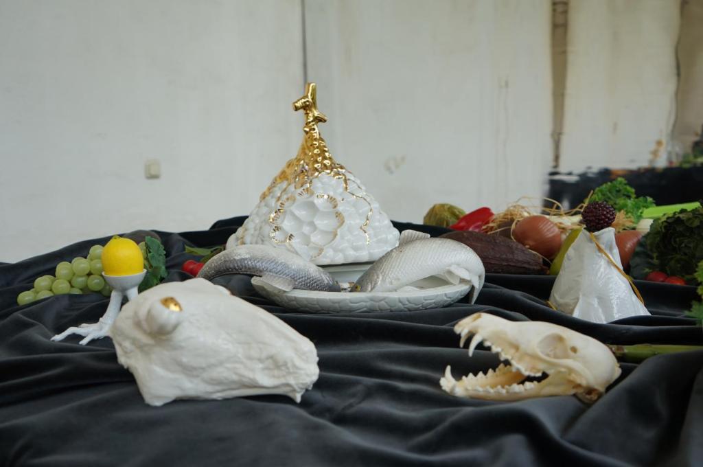 In der Mitte des Raumes steht ein opulenter Tisch, auf dem Obst und Gemüse, Fleisch und Fisch aus feinem, strahlend weißem Porzellan schwimmen. In ihrer Zerbrechlichkeit stehen sie für die Vergänglichkeit auf Erden.