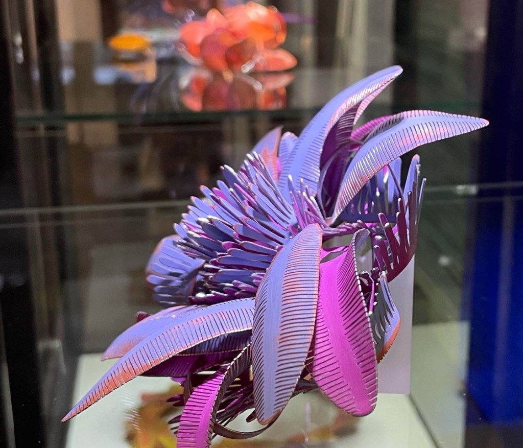 Mirjam Hiller formuliert selbst “ Das Bedürfnis nach Klarheit, Einfachheit, Schutz, Kraft und Endlosigkeit treibt mich an. Ich bin auf der Suche nach einer Form, die all dies in sich vereint, einer Form, die angesteckt und auf der Brust getragen werden kann, an der Stelle, die so verletzlich ist. Als Material wähle ich ein Metall, das mich seit Jahren fasziniert, Edelstahl. Es ist mir vertraut, es inspiriert mich immer wieder aufs Neue und fordert mich heraus. Es ist ein Material, das mich trotz seiner Härte, seiner Kühle, seiner Strenge in den Bann zieht, da es sich an ungeahnte Grenzen führen lässt und da ihm trotz seiner relativen Leichtigkeit eine große Stärke innewohnt. Auf das Edelstahlblech kommt die Farbe. Ich brauche Farbe. Sie macht mich glücklich, fängt mich auf, gibt Energie, Intensität und Tiefe. Sie ist Nahrung. … Die Form, die Wölbung, die Spannung des Metalls, die Farbigkeit – alles zusammen soll eine Kraft erzeugen, die das Auge dazu einlädt darin zu versinken, zu versinken in der Einfachheit. Mit gelöstem Blick verliere ich mich in der Fläche, die zum Raum geworden ist. “